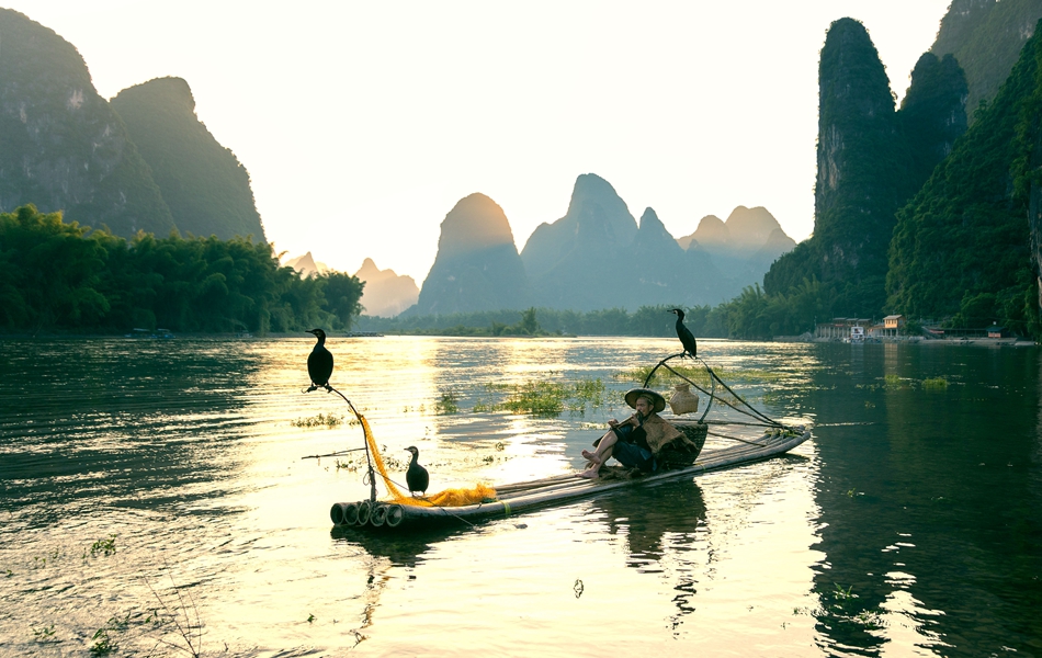 Li River, with a length of 99.5 miles, is one of the most beautiful rivers in the world with high reputation. Verdant hills, bamboo forests, crystal clear water, fishing boats with cormorants standing on boards and ancient villages are along the river to compose a charming picture. The most fantastic scenic spots are in Caoping, Yangdi and Xingping, with the Crown Cave, Langshi Village, Nine Horse Painting Mountain and the Reflections of Yellow Cloth, etc.