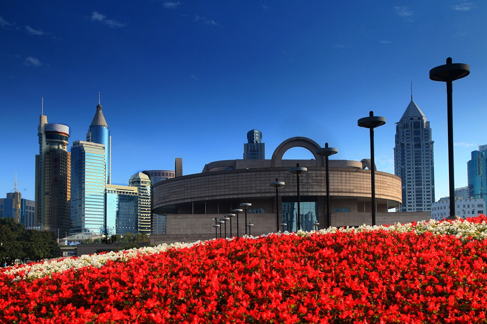 In and around the square, you can find a big fountain, named the Light of Huangpu River, 10,000 square meters of lawns, six groups of relief carvings that depict the history of Shanghai, the New Shanghai Museum, the offices of the municipal government, an underground shopping plaza, the Shanghai Grand Theater and the Shanghai Exhibition Center. There are 5.5 meters wide green belts and 6.5 meters wide passages for non-motorized vehicles on both sides of the 600 meters long and 32 meters wide People's Avenue.