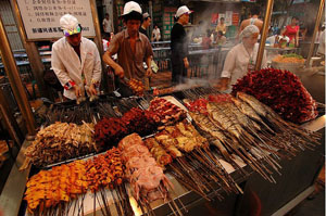 Xinjiang Kebabs are chunks of mutton threaded on skewers and roasted over charcoal. The kebabs are turned continually and basted frequently, and when they are almost done, salt, pepper, paprika, and cumin are sprinkled on them. Kebabs are crispy outside and tender inside, slightly salty and hot. They are not greasy and have no unpleasant smell. They are sold in the streets and bazaars throughout Xinjiang. The Yang Fan Kebabs at May the First night market is one of the most popular kebab restaurants in Urumqi.