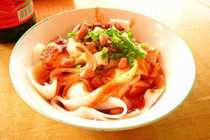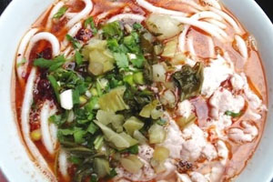 Made by thick flat rice noodles, this snacking dish is eaten by locals frequently as a light meal or to tide off hunger. The red oil sauce makes liberal use of Sichuan pepper a distinctive numbing sense on the tongue. It also leaves a peculiar tickle in the back of the throat making it worth of a try. Aside from the red oil sauce, it contains a few scraps of meat and preserved vegetables.